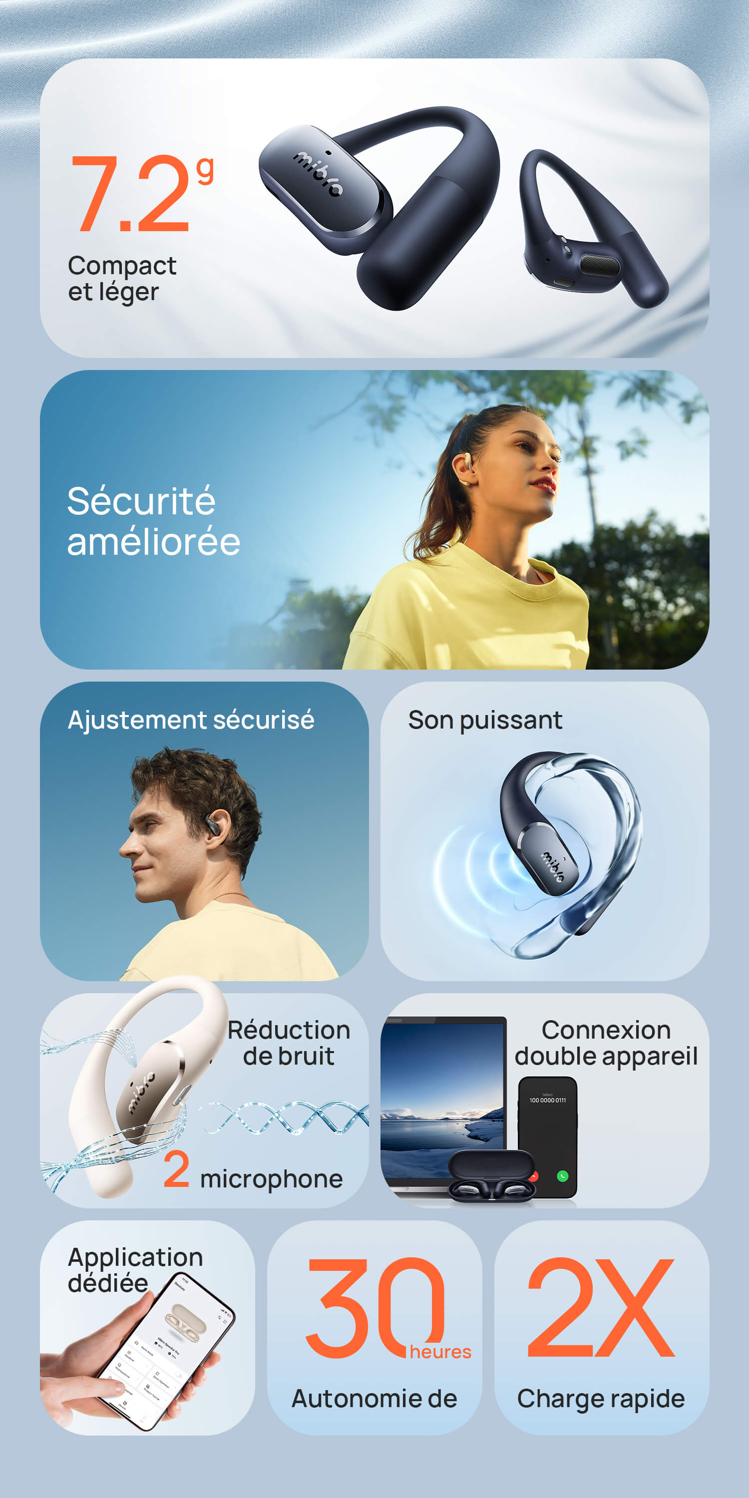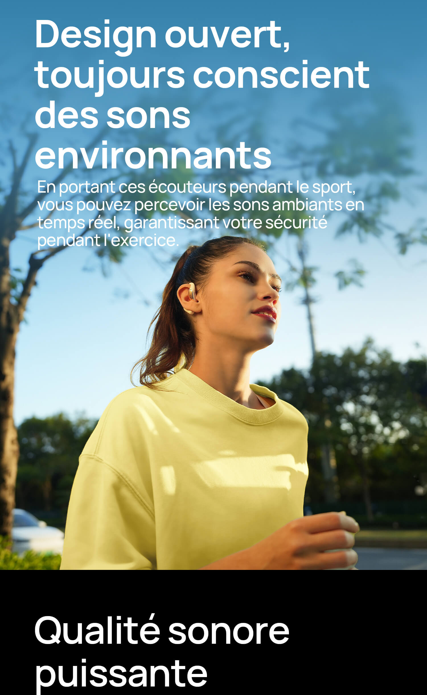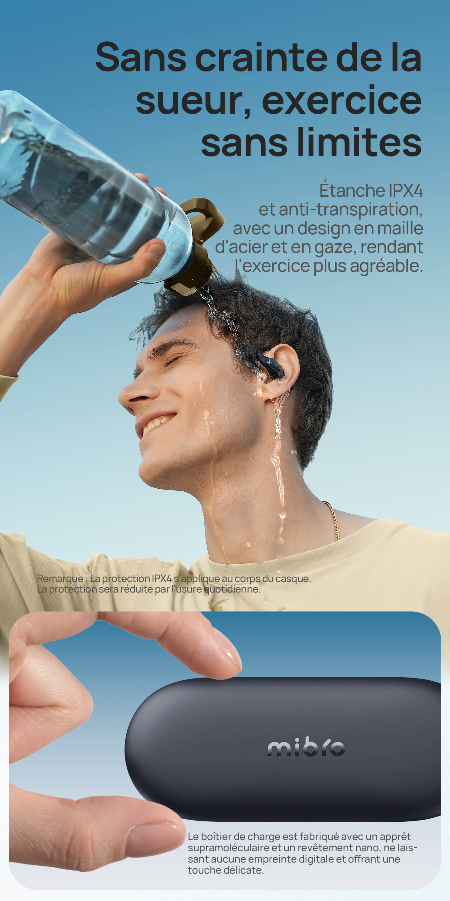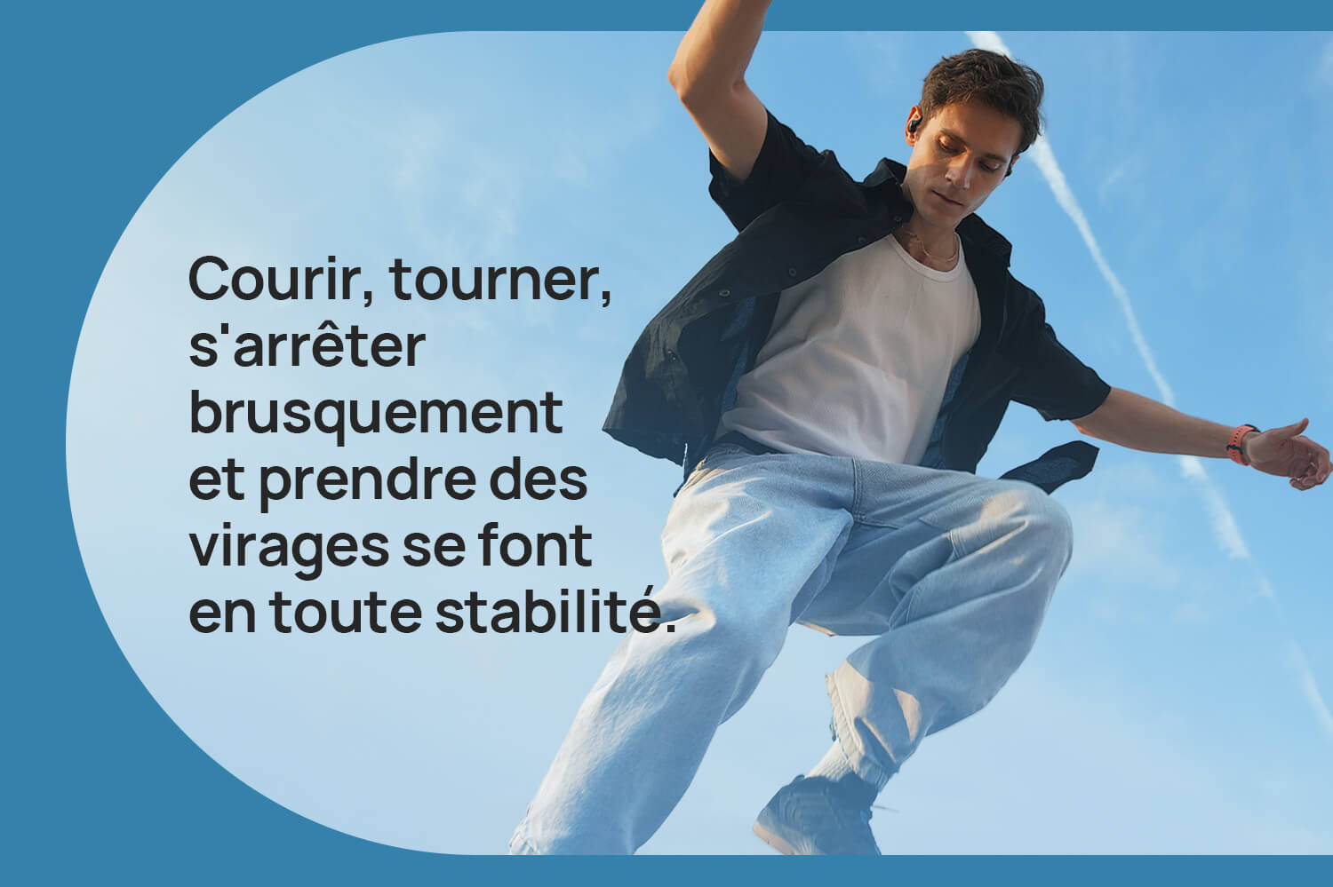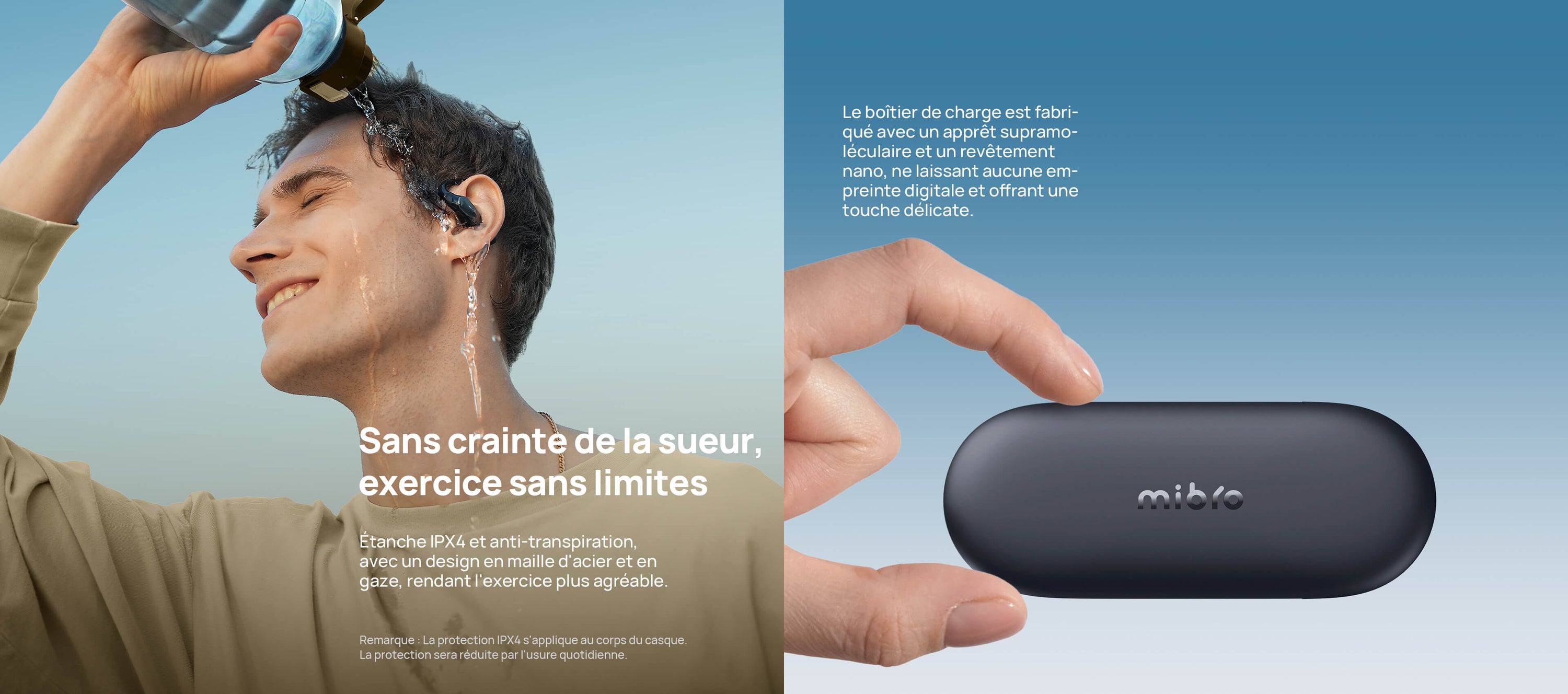 Étanchéité IPX4 anti-eau et transpiration. Course, virages et arrêts stables, pour un entraînement plus agréable.