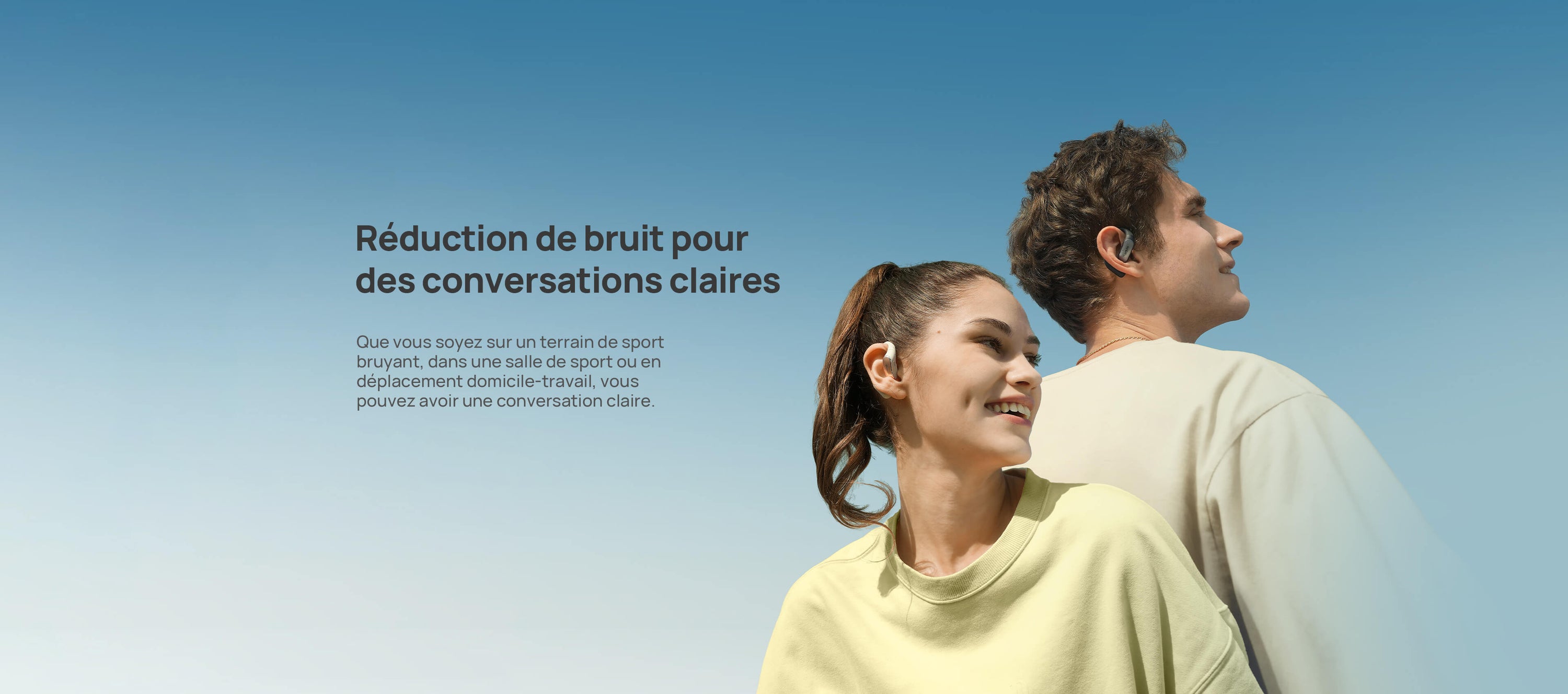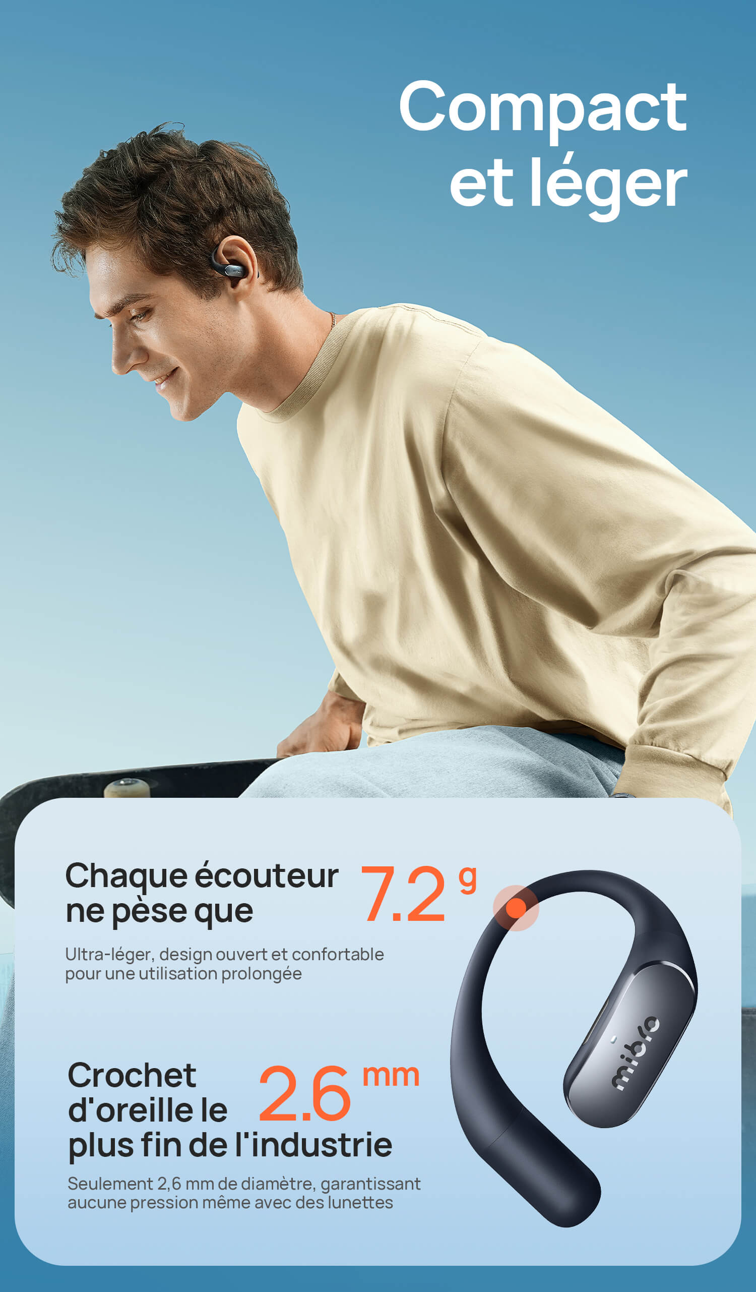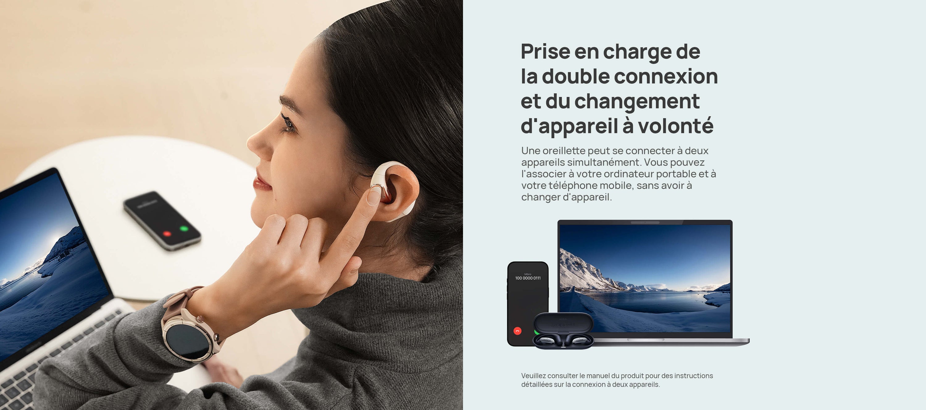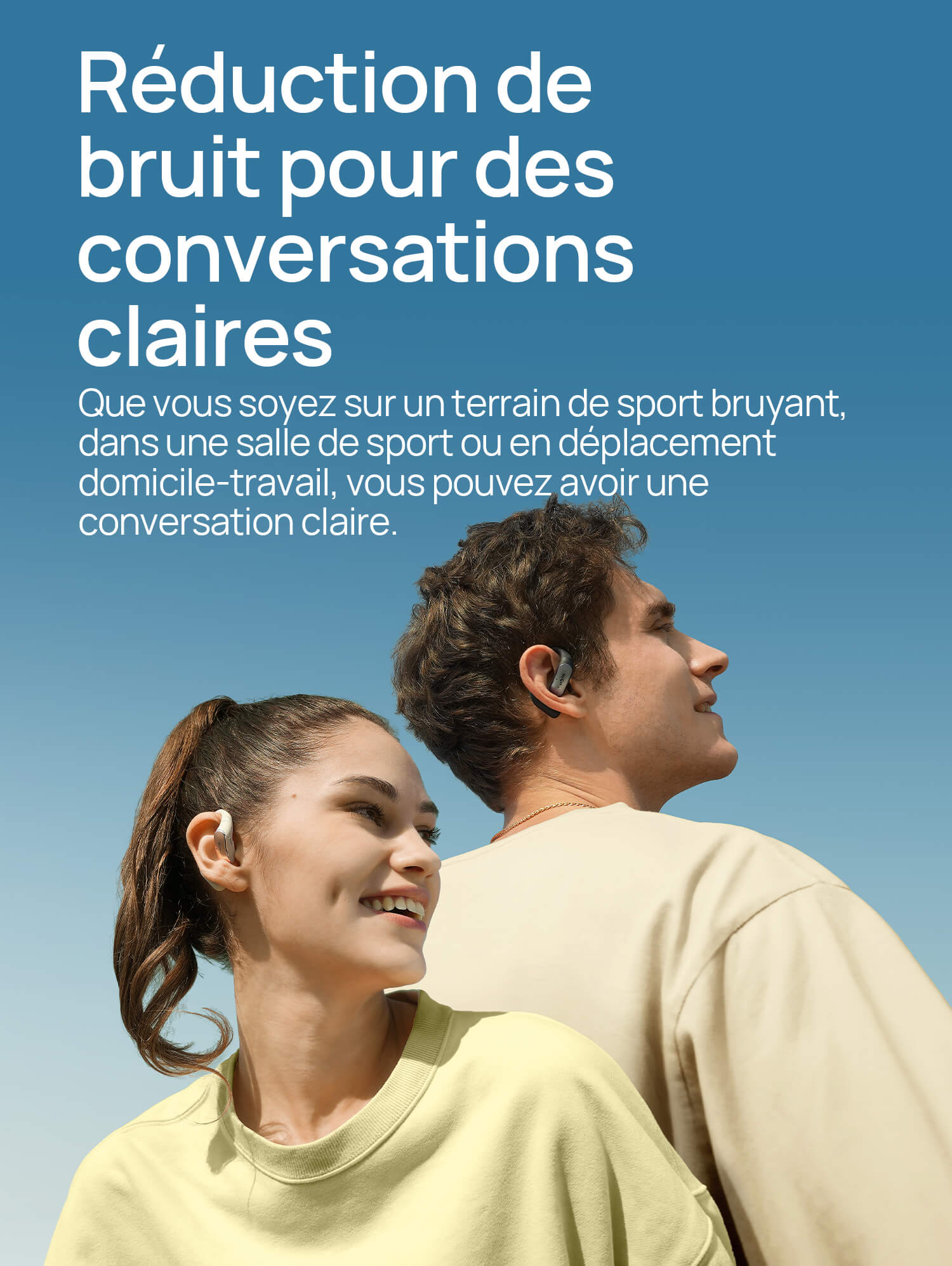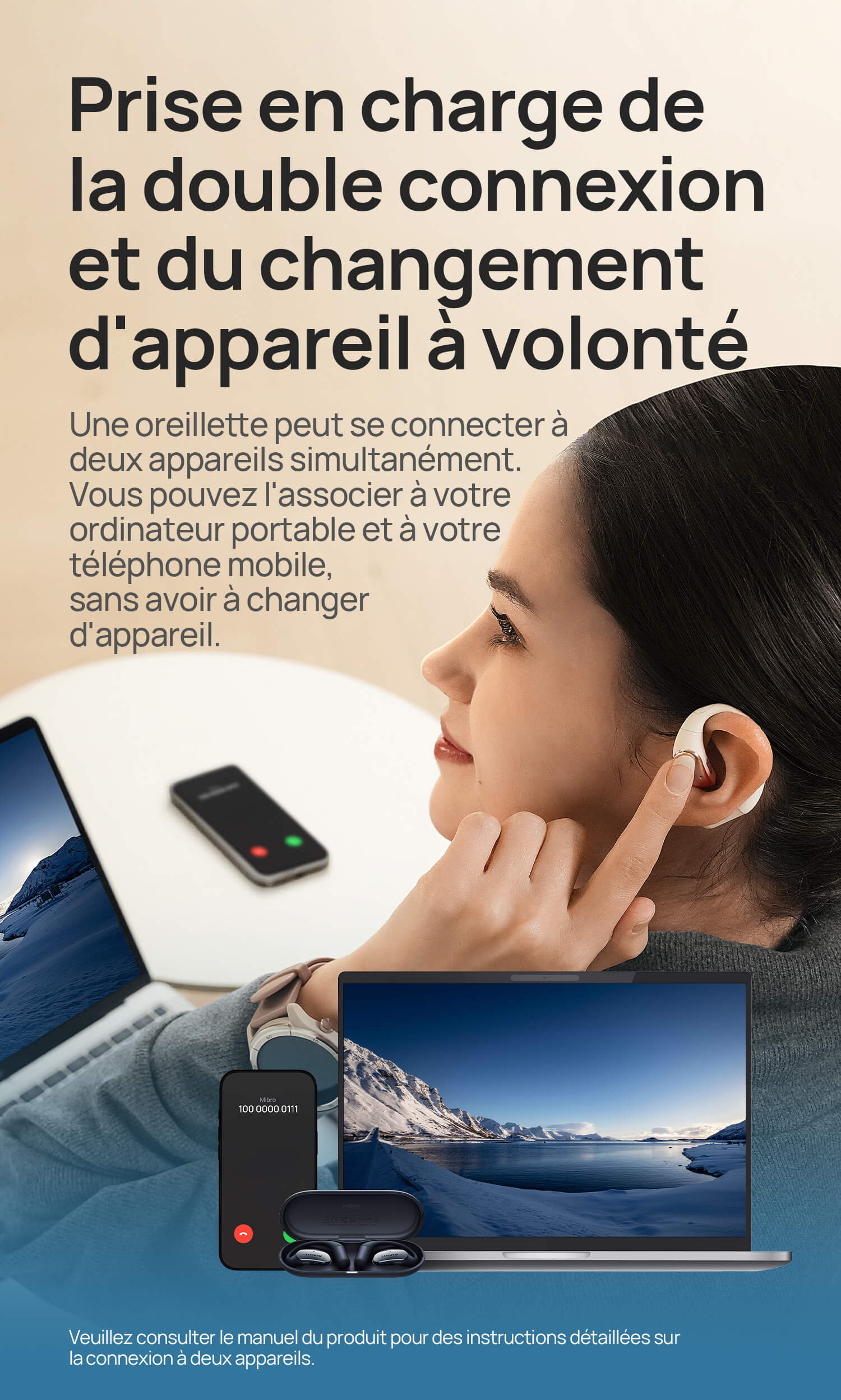 Touchez pour play/pause, balayez pour le volume. Bluetooth 5.4 connecte 2 appareils simultanément (ex. téléphone + PC).