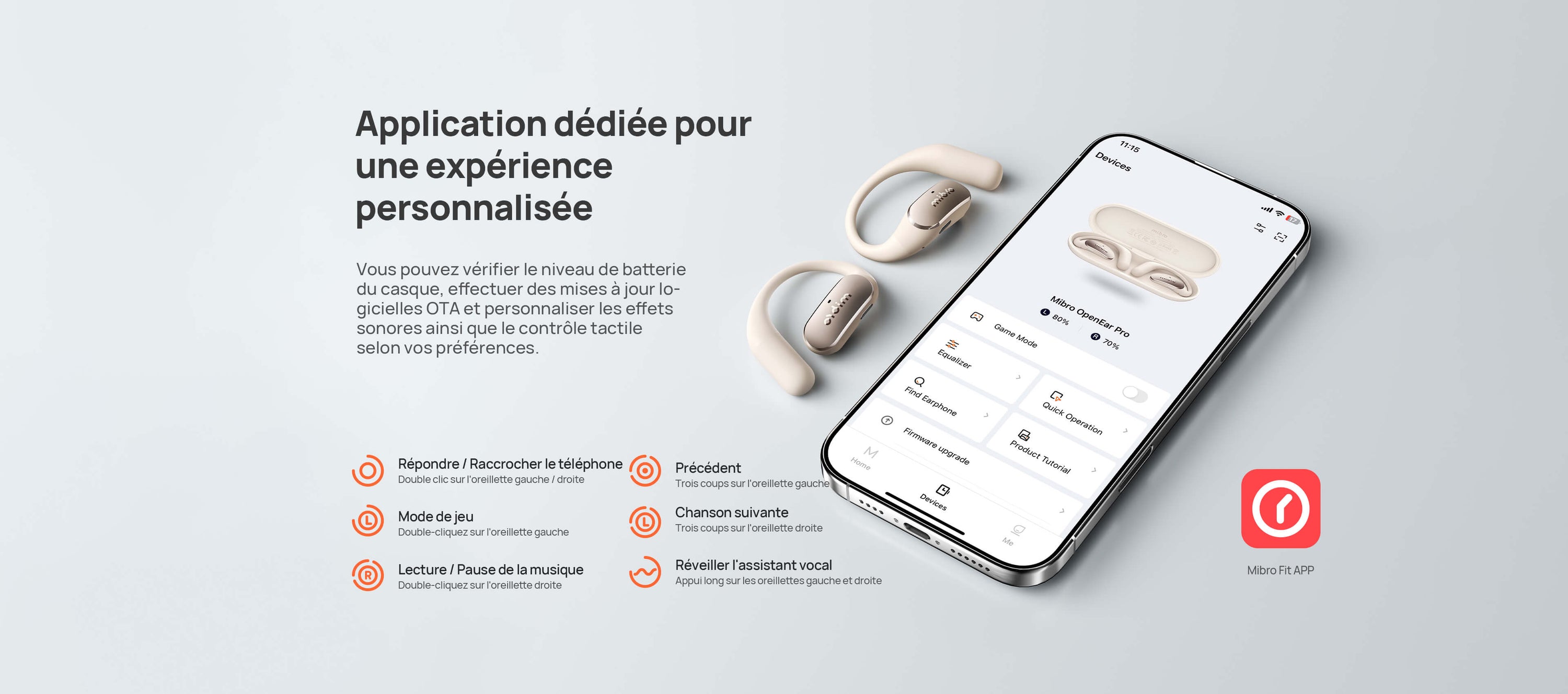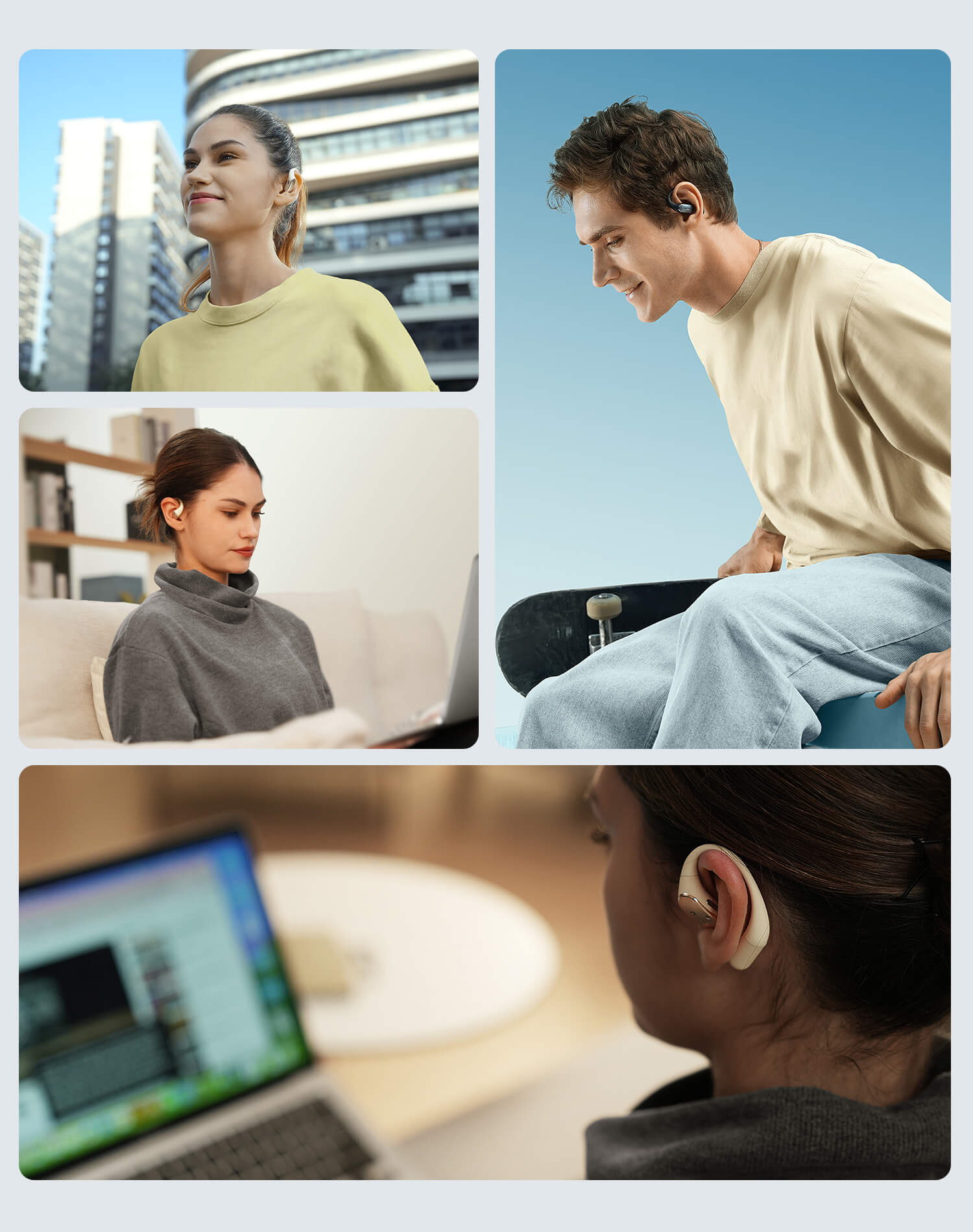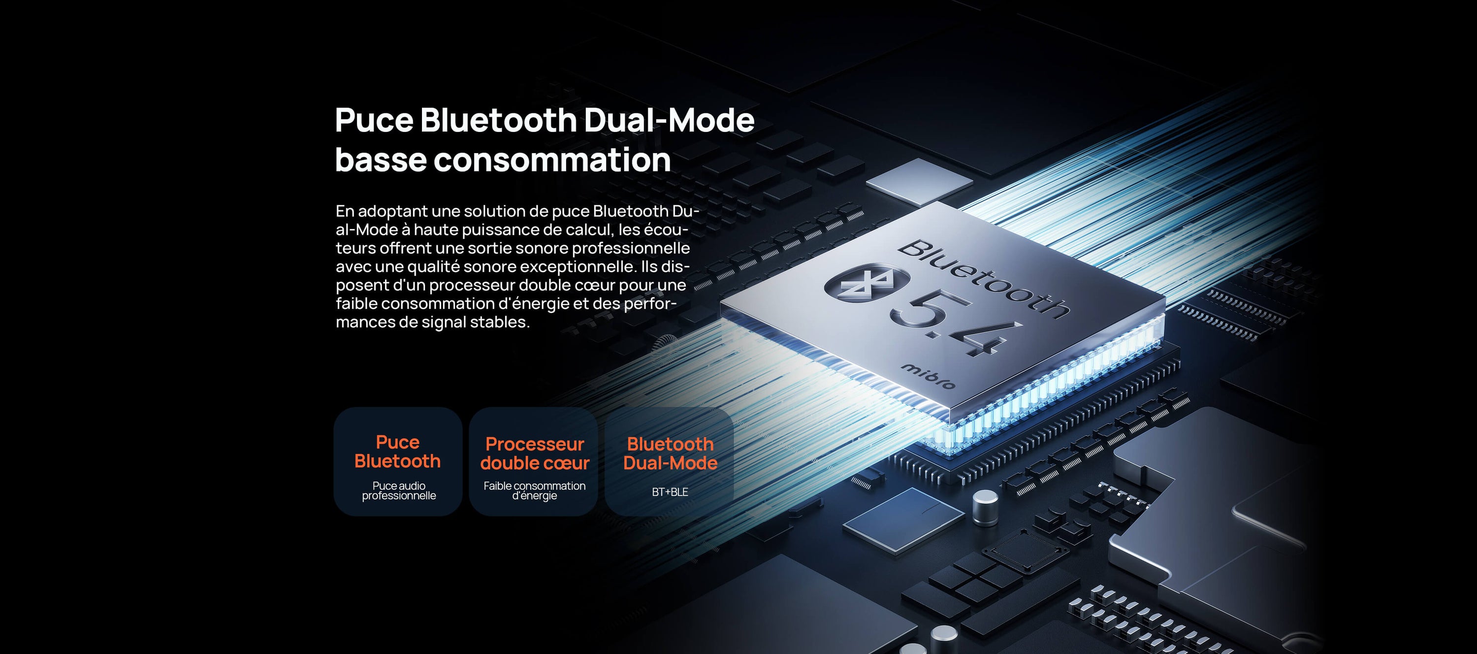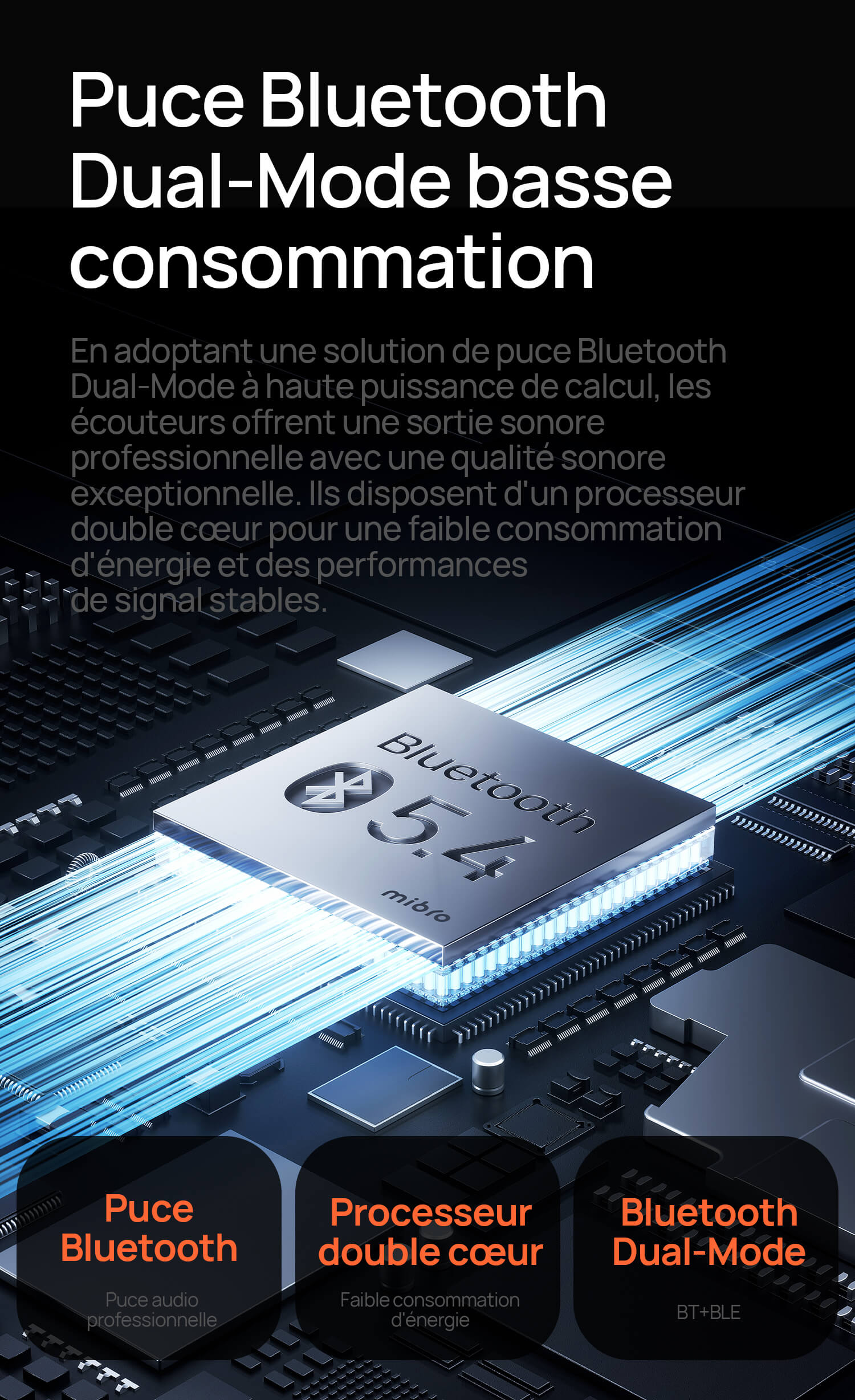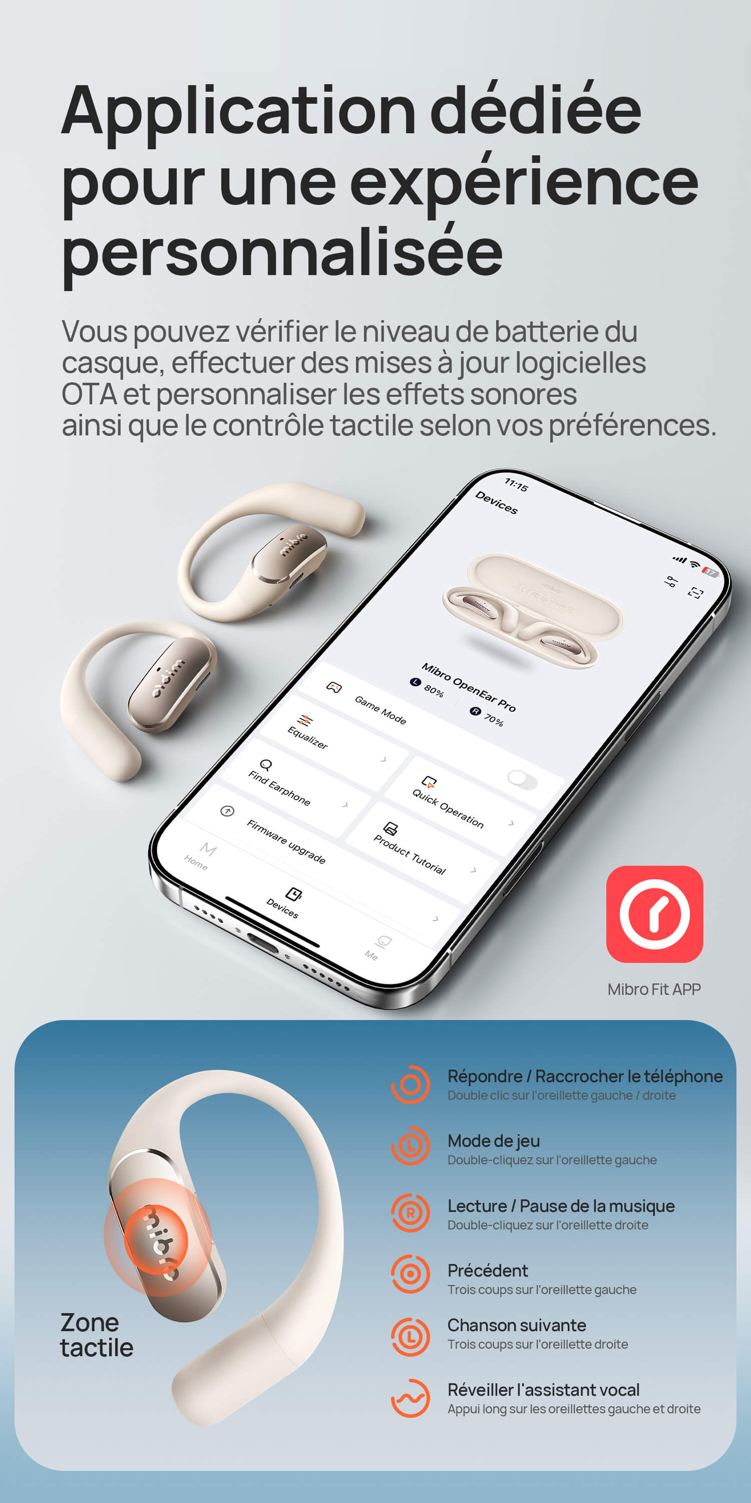 Touchez pour play/pause, balayez pour le volume. Bluetooth 5.4 connecte 2 appareils simultanément (ex. téléphone + PC).