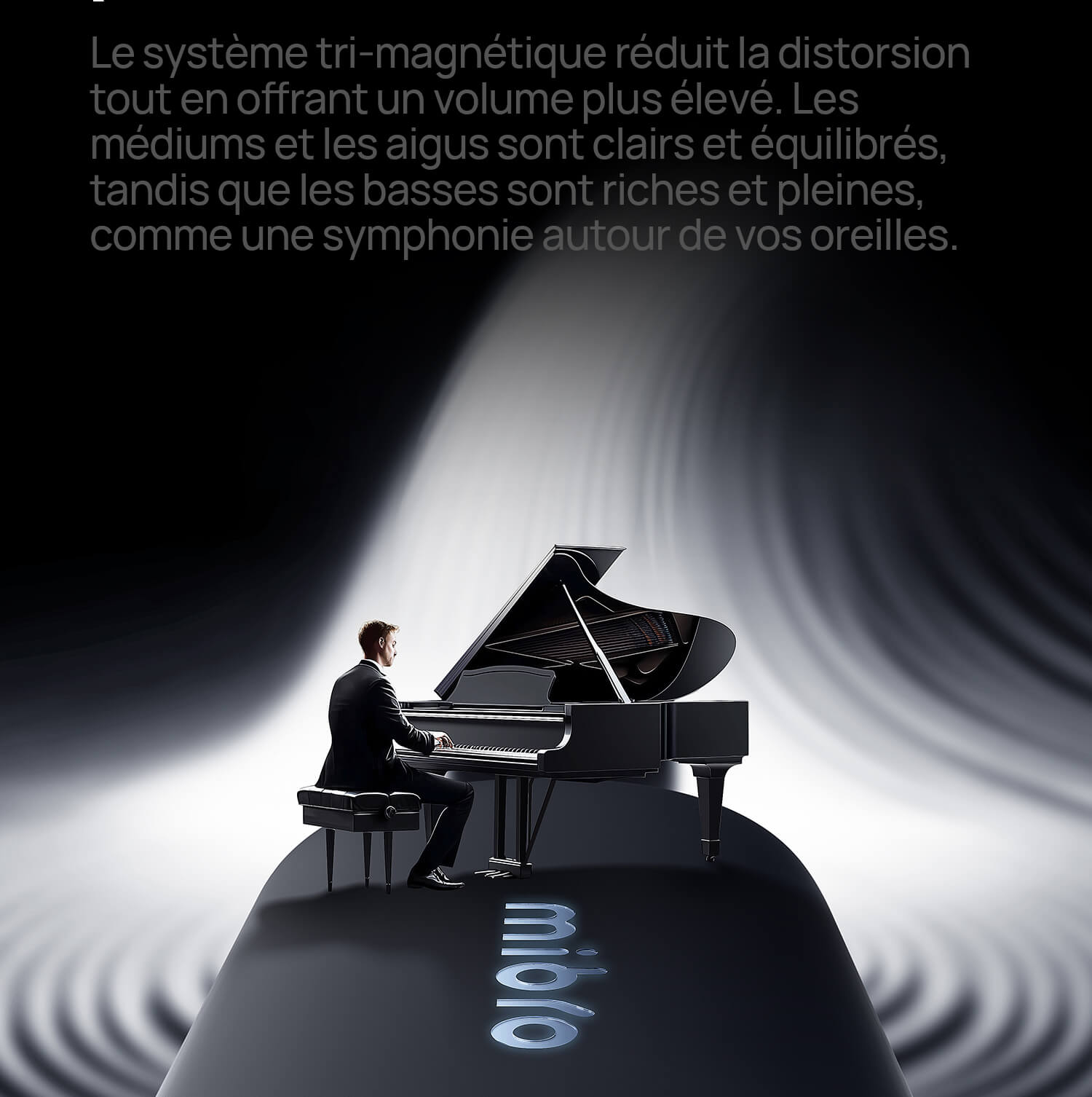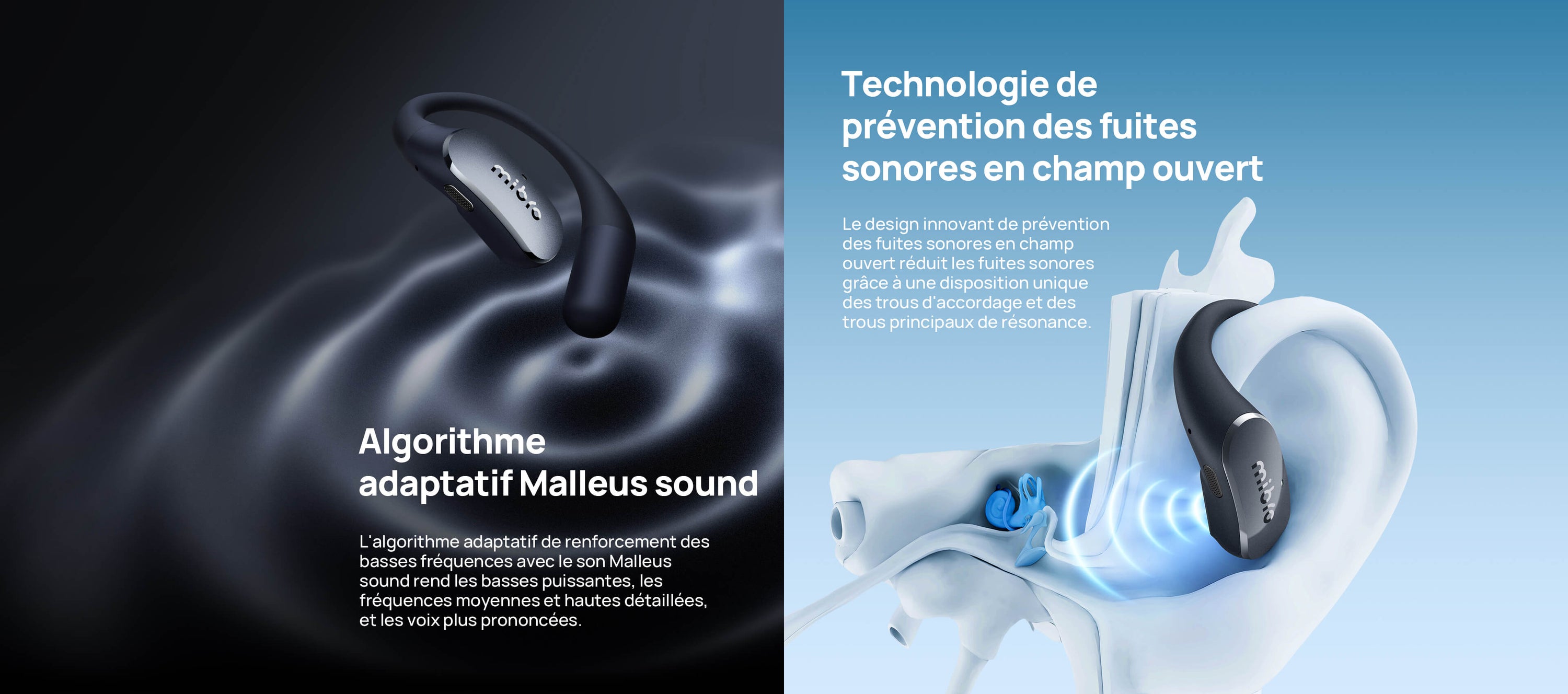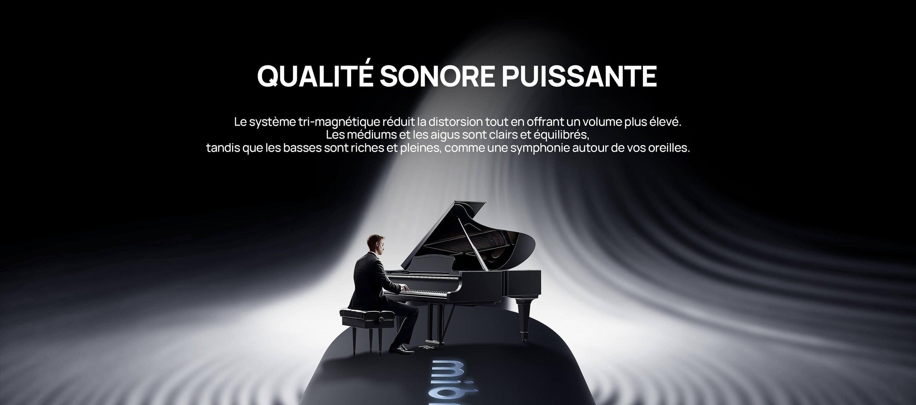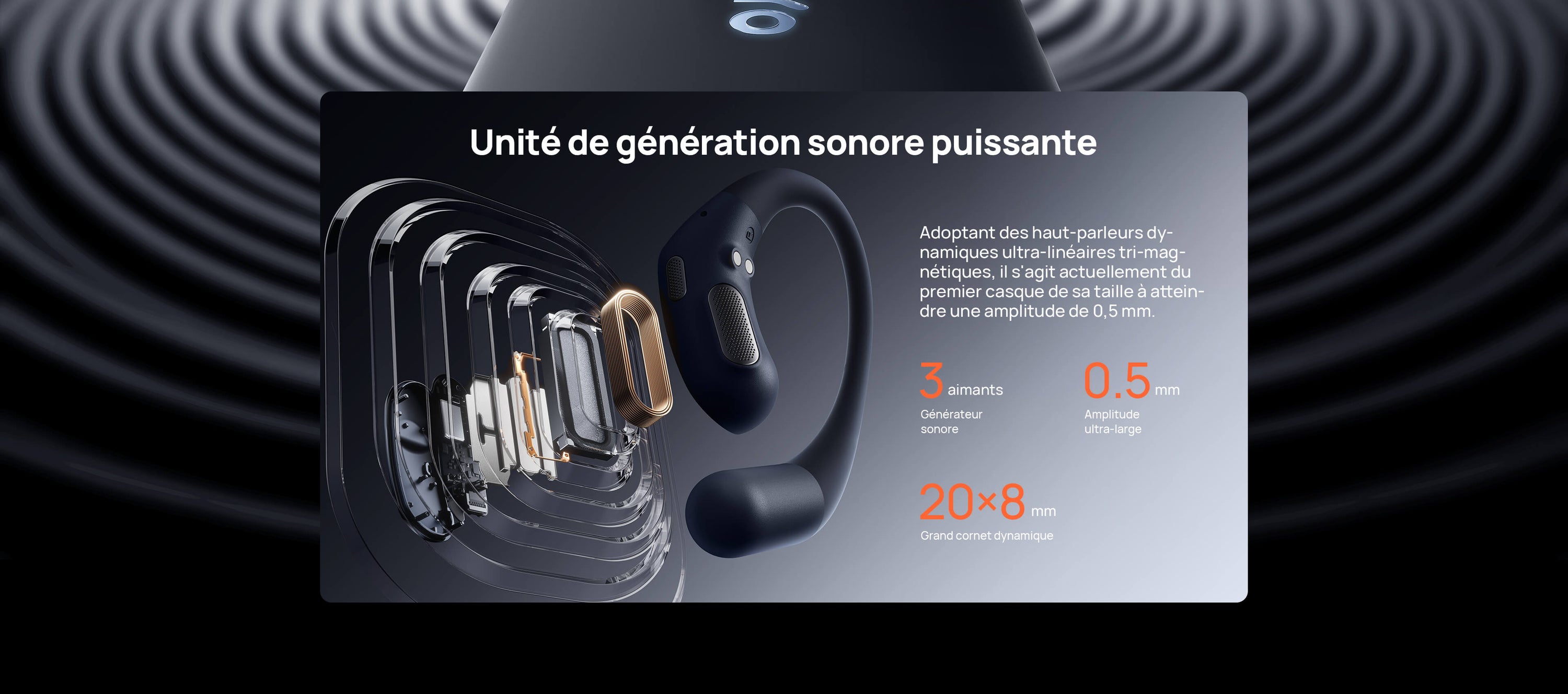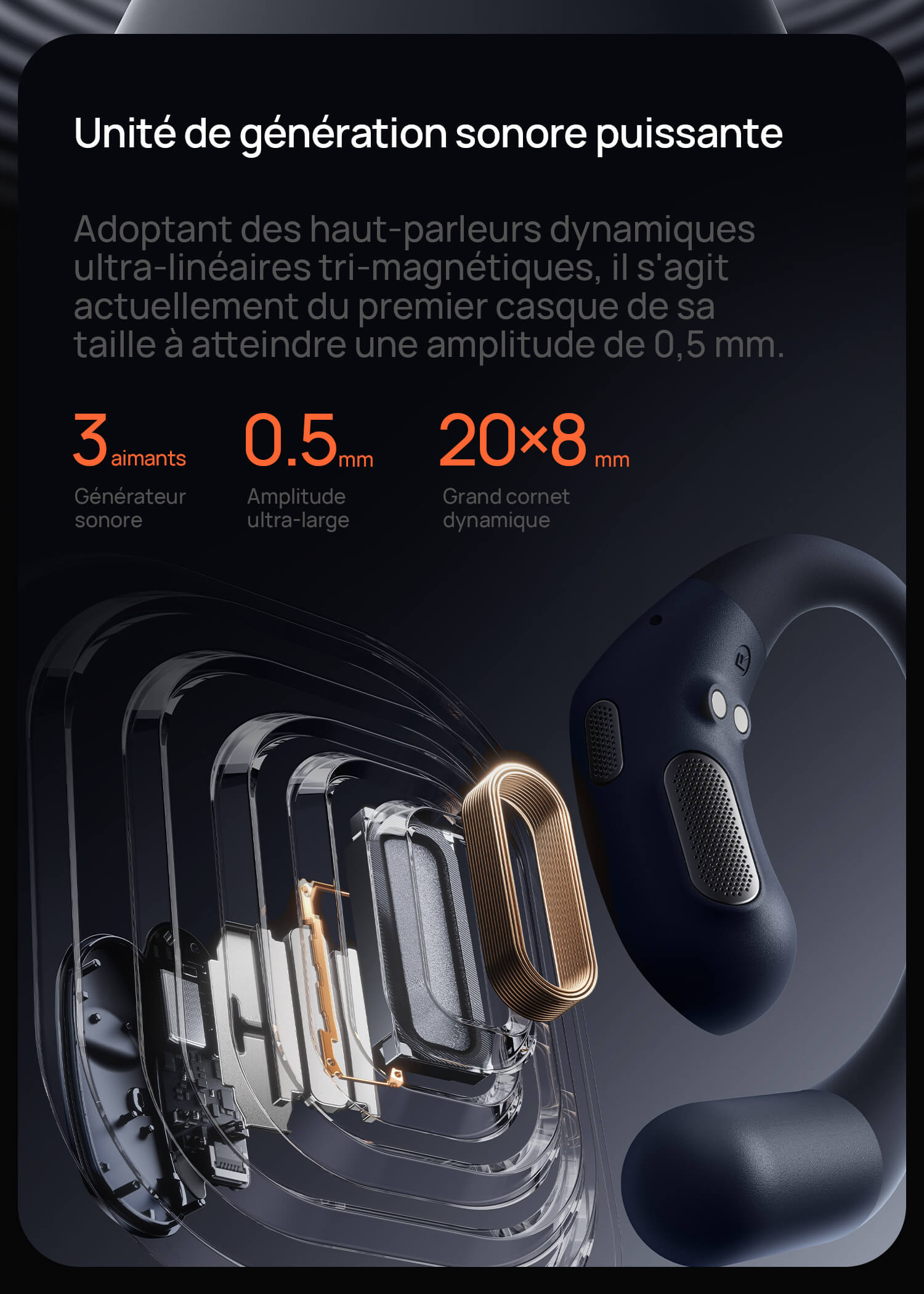 Acoustique ouverte préserve les sons ambiants. Des trous sonores uniques réduisent les fuites. Médias et aigus clairs, basses profondes.