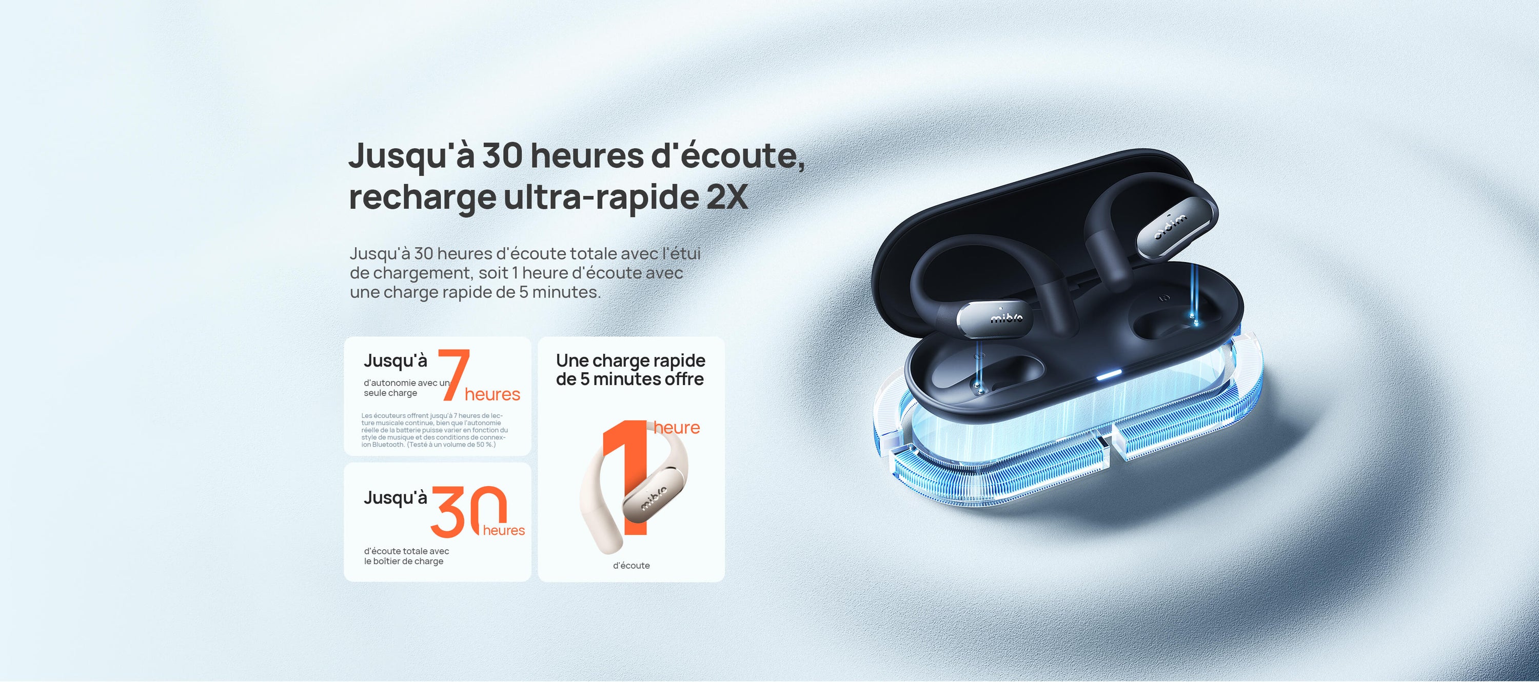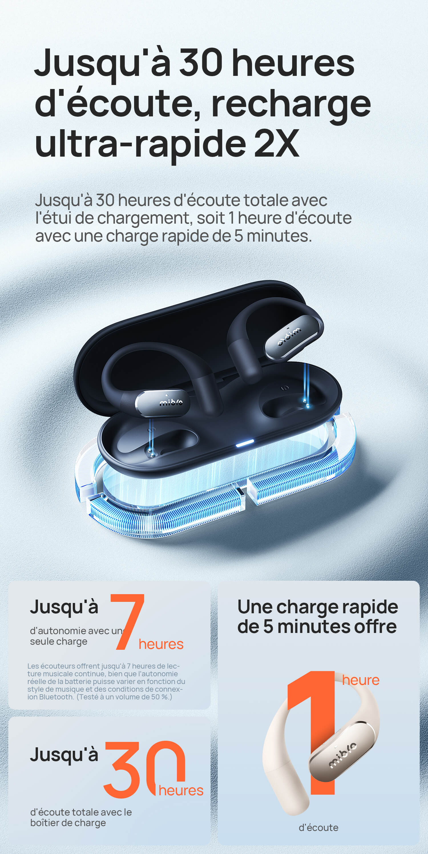 7h par charge + 30h via l’étui. 10 min de charge = 2h de musique. Étui magnétique ultra-compact.