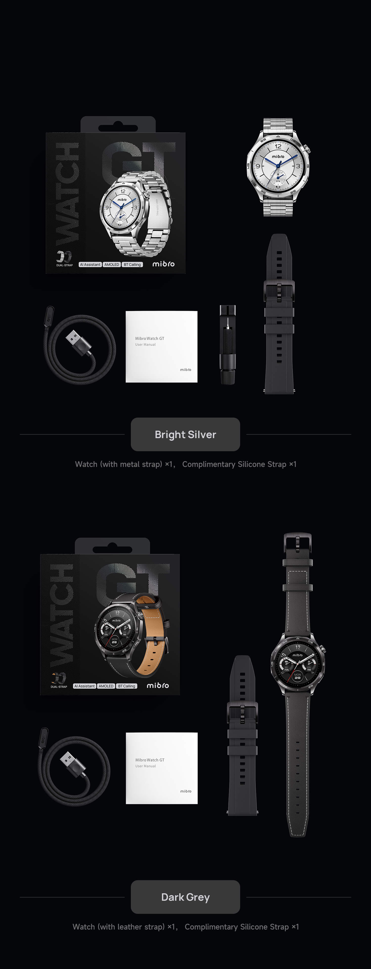Includes one stainless steel strap, one black silicone strap, and one charging cable.