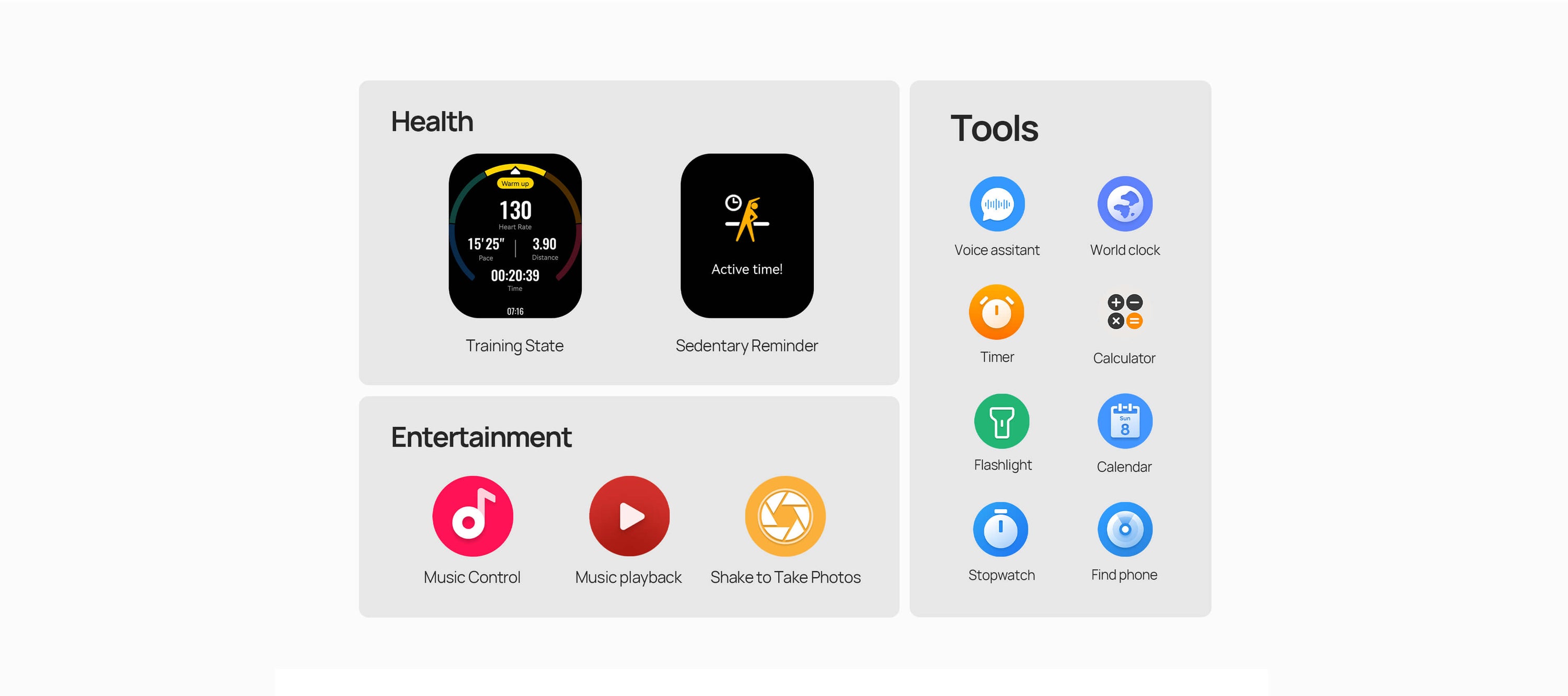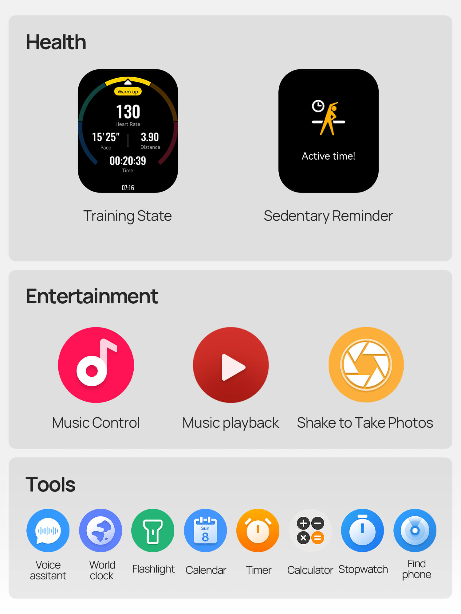 Heart Rate,SpO2,Motions record,Breath,Preesure,Sleepping record,Altitude, Compass, Dice,Timer,Alarm,Stop watch,Calculator,Calendar,Weather,Women's health,Find your phone,Bluetooth call, Music control, Music playing,App message reminder,Incoming call reminder,Health Reminder.