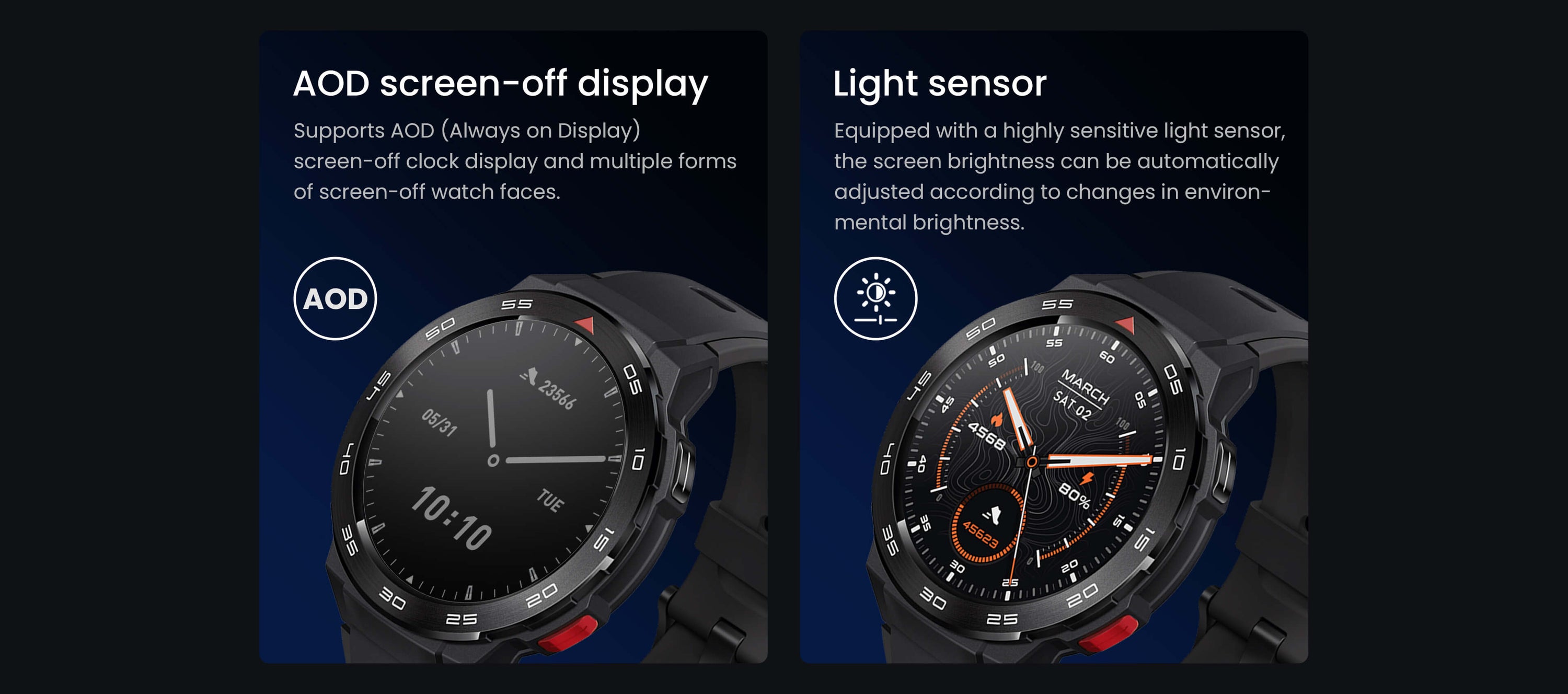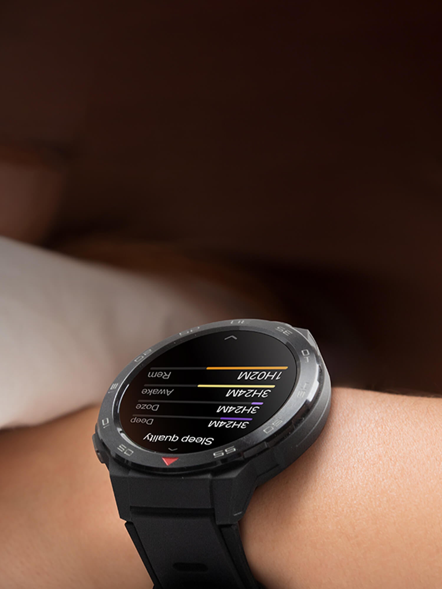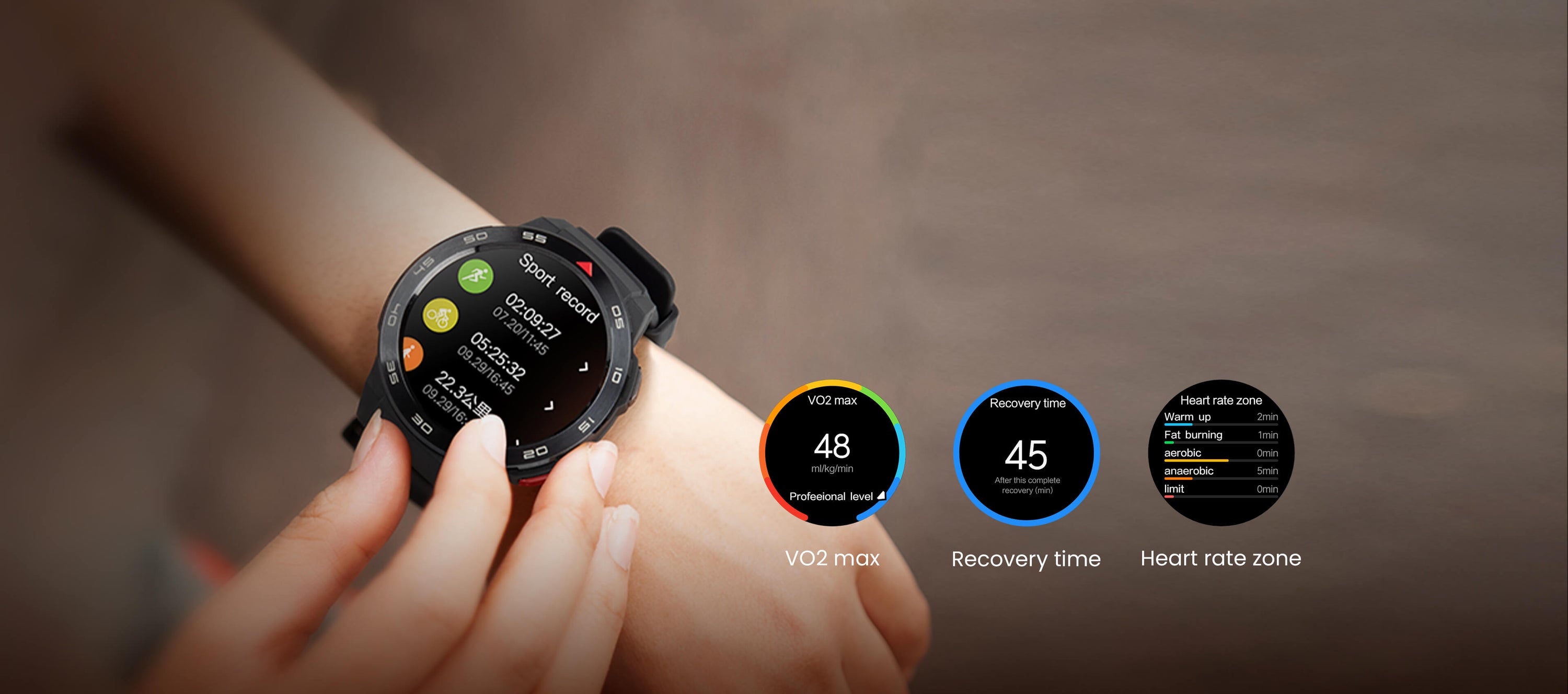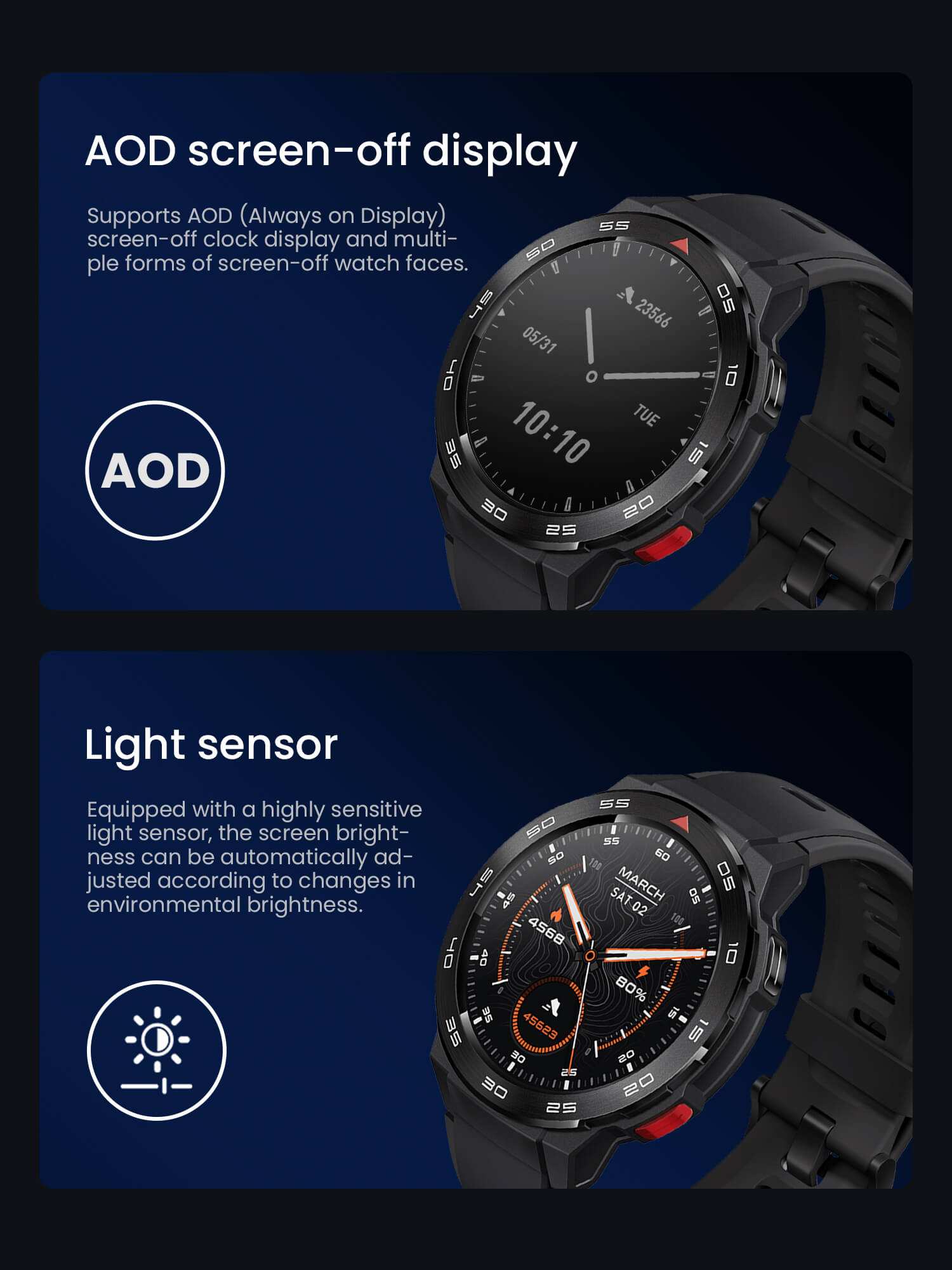 Étanchéité 5ATM, 105 modes sportifs avec capteurs à 9 axes. Mesurez l'altitude, la pression, et plus encore en levant le poignet.