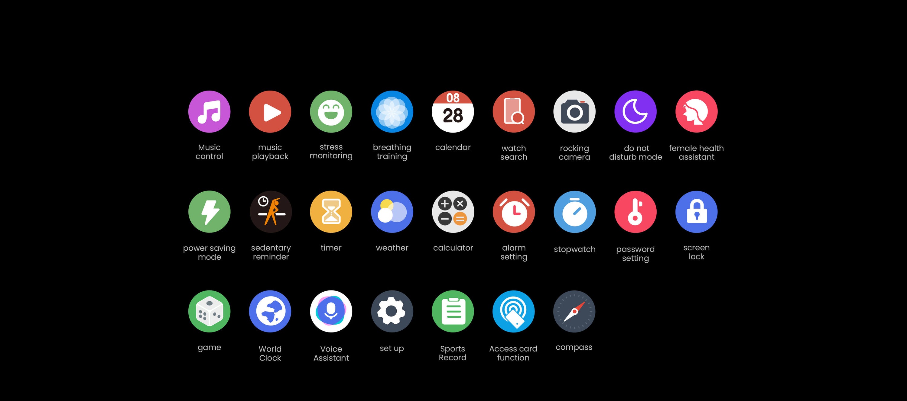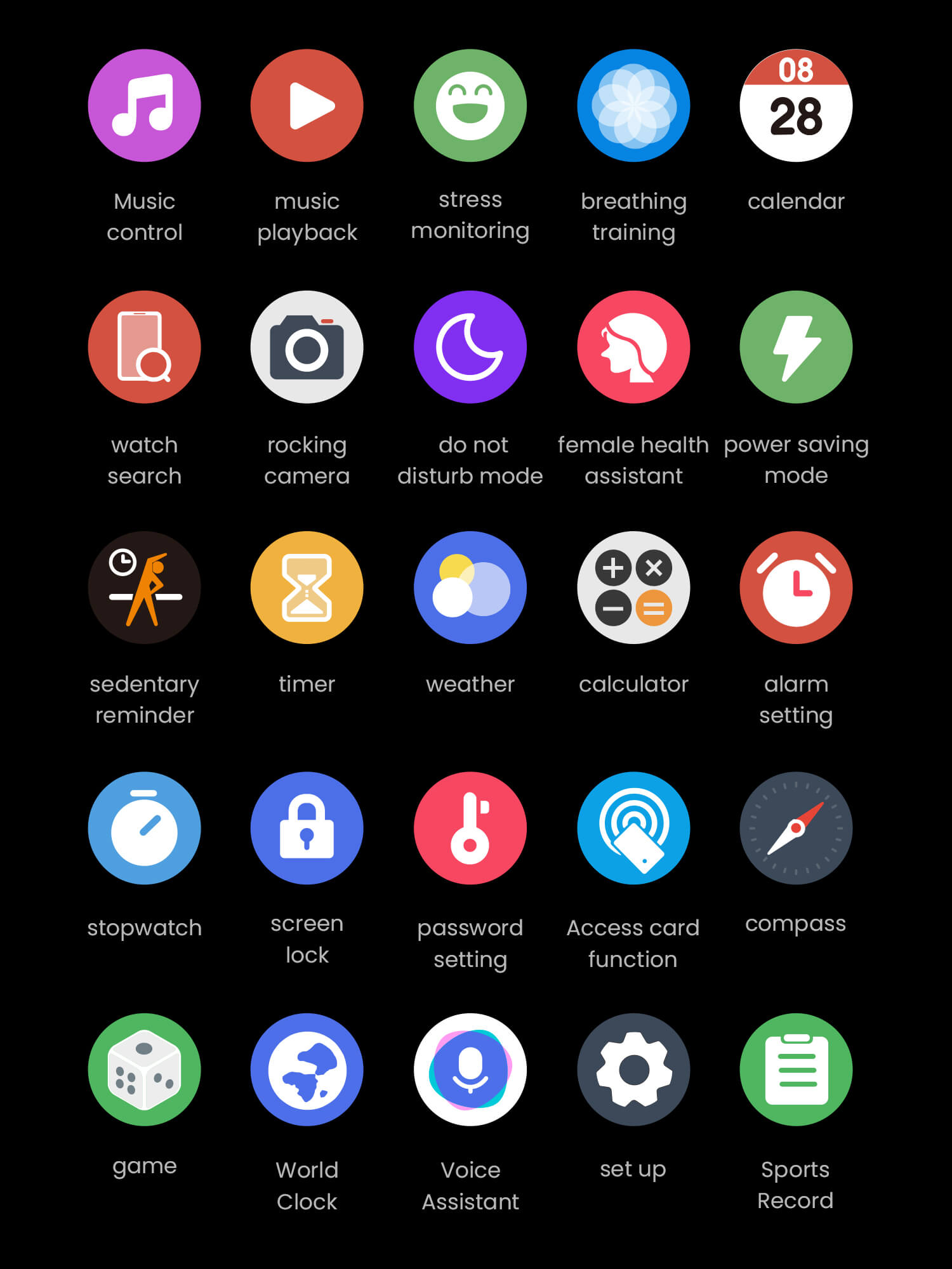 Fréquence cardiaque, SpO2, enregistrement des mouvements, respiration, pression, enregistrement de la respiration, altitude, boussole, dés, minuterie, alarme, chronomètre, calculatrice, calendrier, météo, santé des femmes, recherche de votre téléphone, appel Bluetooth, contrôle de la musique, lecture de la musique, rappel de message d'application, rappel d'appel entrant, rappel de la santé.