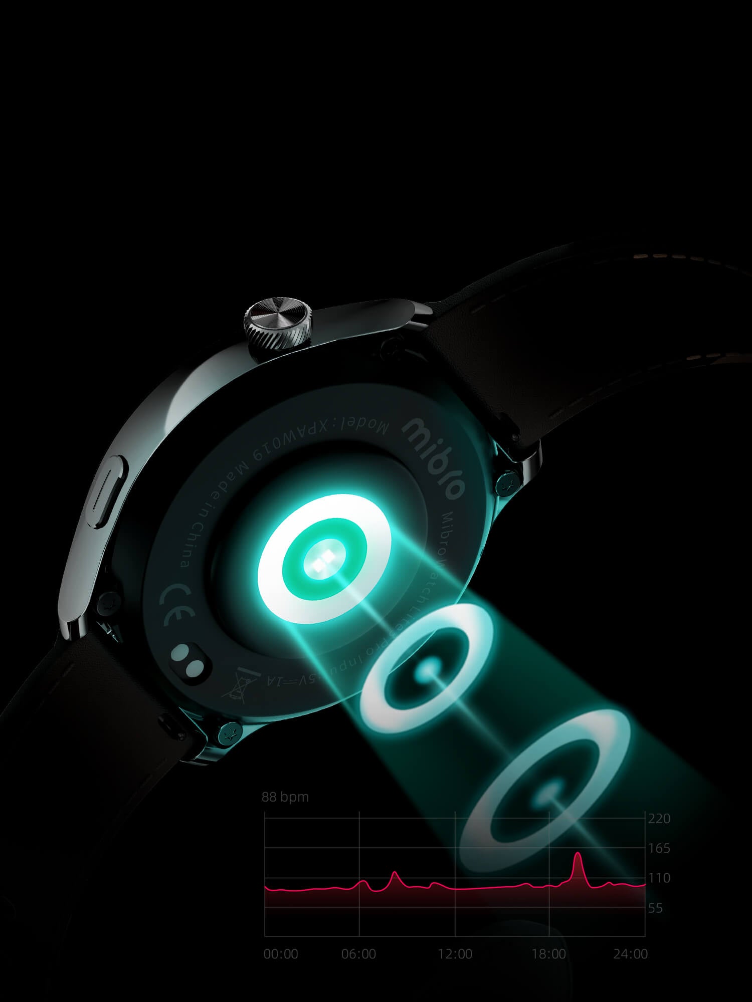 Système de détection biologique à matrice circulaire pour un suivi 24/7 de la fréquence cardiaque, de la mesure du SpO2, de l’entraînement à la respiration, du sommeil, de la santé des femmes et du stress.